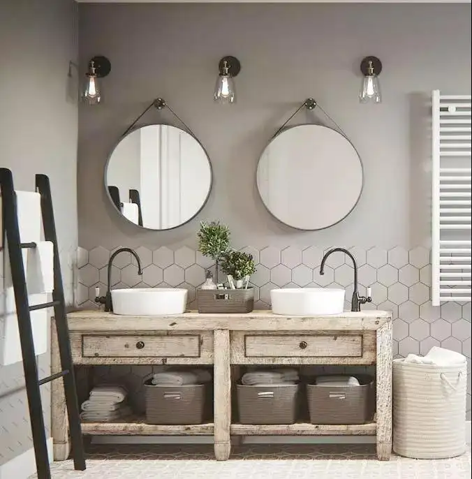 ▲充滿年代感的木質(zhì)洗漱柜,與對稱的圓形臺上盆、懸掛圓鏡以及蜂窩狀的六邊形瓷磚墻搭配在一起,竟然毫無違和感,反而在古樸與現(xiàn)代的激情碰撞中,驚艷了空間,溫暖了歲月。
