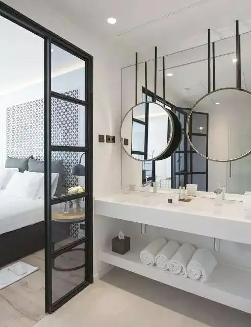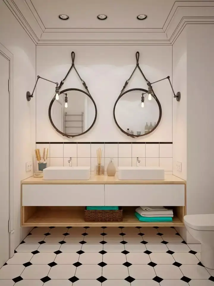 ▲白色雙臺盆與整個臺面和諧地融為一體,清爽干凈,充滿設(shè)計感。臺下是儲物空間,鏡面上再懸掛兩面具有反光效果的大圓鏡,使得整個空間處處透著明亮和通透的氣息。