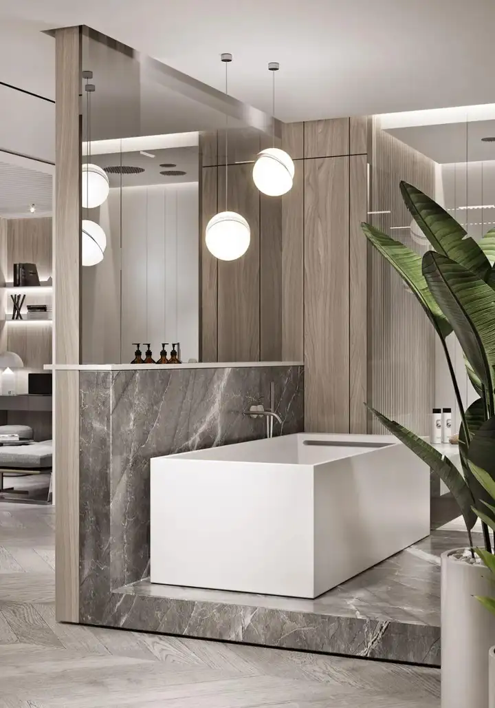鏡子/玻璃隔斷分隔空間的同時增加空間通透感,視覺上也有延伸的作用。