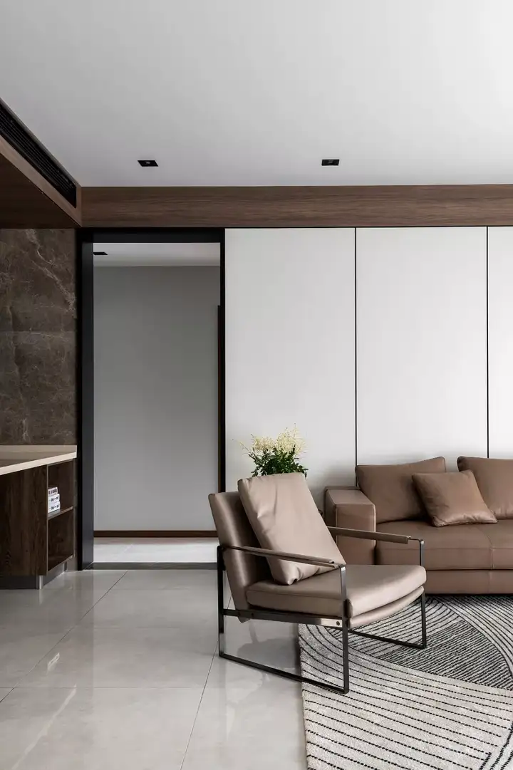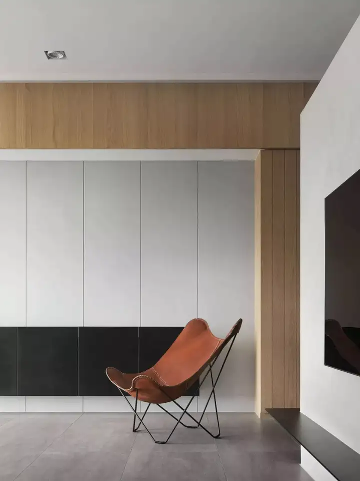 窄框線+原木,木紋和線條的相互襯托,在室內(nèi)模擬自然的開闊感。