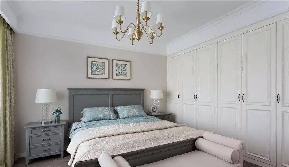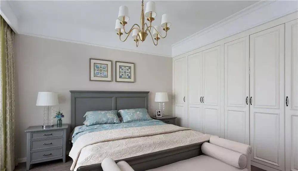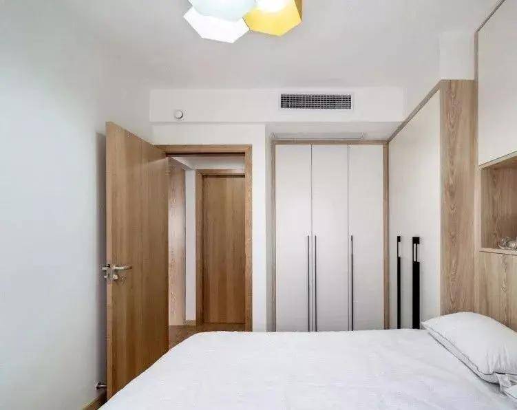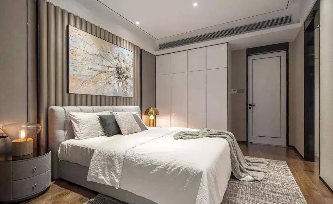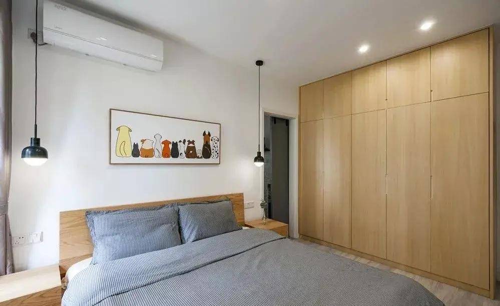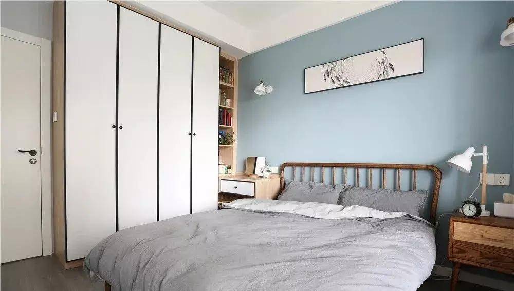 將衣柜與床頭柜巧妙地設(shè)計在單獨一面墻上,形成一個整體的儲物空間,不僅方便了日常使用,使收納變得更為輕松,同時也增強了空間的整體規(guī)劃感,營造出更為整潔、有序的居住環(huán)境。